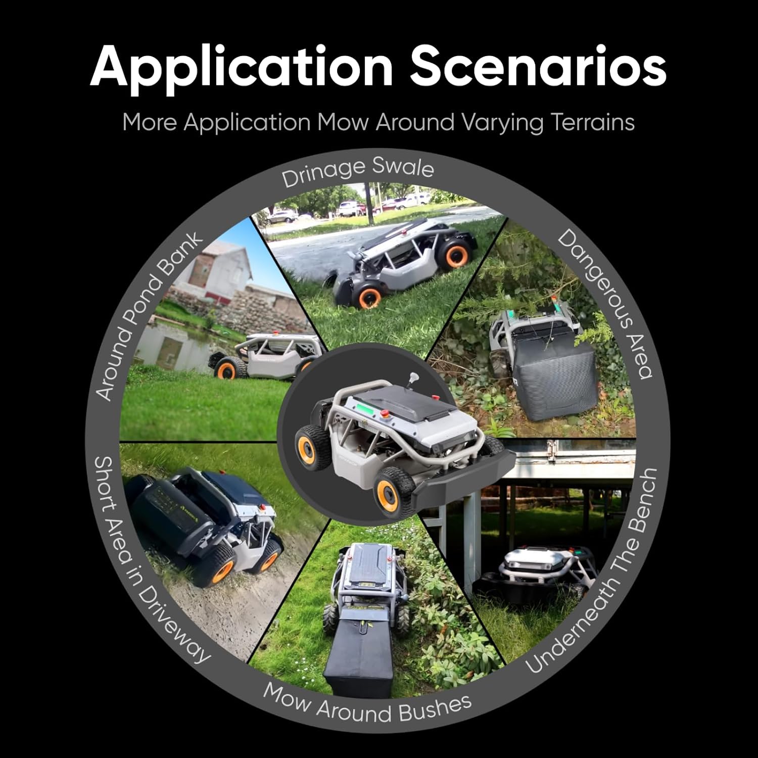 - 🔹 Conquer 75% of grades with ease and safety – 1000 watt motor + FOC electronic brake for strong traction. No push – the remote control cuts up to 300% faster on slopes than conventional mowers with zero tipping risk.